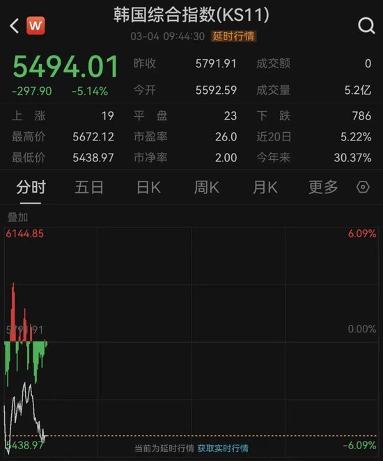 此外,韩国综合股价指数200期货指数4日开盘后一度暴跌超过5%,触发熔断机制。